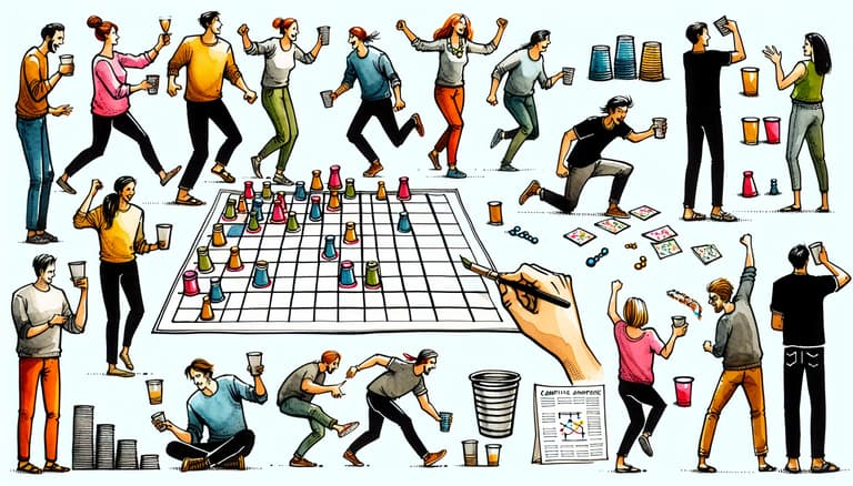 To play, prepare a table or flat surface with a 3x3 grid made from masking tape. Fill disposable party cups with your choice of drinks in two different colors for each team. The objective is to have one player from each team race to finish their drink and successfully perform a flip cup. Once completed, they place the upside-down cup on the grid, aiming to create a sequence horizontally, vertically, or diagonally before the opposing team does so.